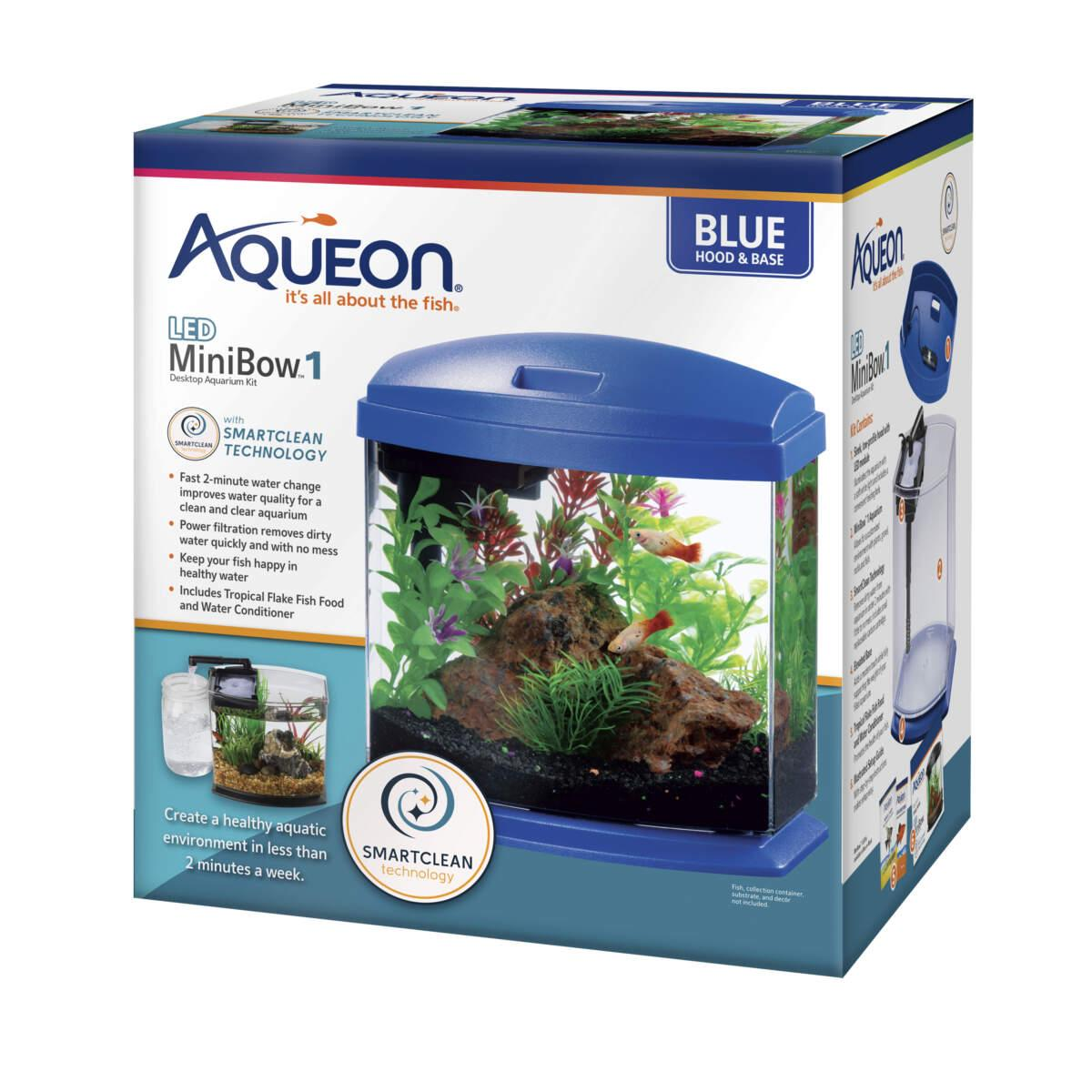 Aqueon® LED MiniBows™ Kits with SmartClean™ Technology are great for first time and experienced fish keeper. These desktop aquariums are great for bedrooms, living rooms, home offices and more. Each kit includes a clear acrylic vessel, low-profile LED hood, elevated base, filter cartridge, water care and food samples to get you started. Also included is a uniquely designed power filter with SmartClean™ Technology that makes essential water changes quick, fast and easy to do in less than 2 minutes! In just a couple minutes each week helps maintain a cleaner and healthy aquatic environment with Aqueon® LED MiniBow™ Kits with SmartClean™ Technology. Uses Aqueon Small Replacement Cartridges. Replace every 4 weeks for optimal performance.